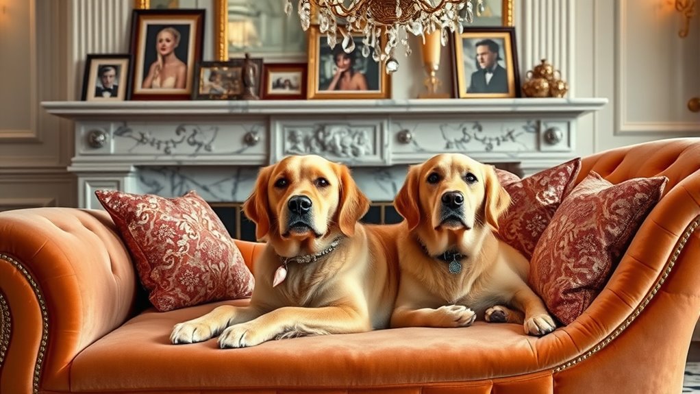 The trend of pet fashion and luxury accessories has skyrocketed in Hollywood, transforming pets into style statements and status symbols. Celebrities now invest heavily in pet grooming to ensure their animals look flawless, often dressing them in designer outfits and custom jewelry. Luxury accessories, like jeweled collars and monogrammed beds, are common sights, reflecting their owners’ wealth and taste. Dietary routines are also part of the pampering, with high-end, organic foods and specialty treats tailored for each pet’s needs. These trends emphasize that pets aren’t just companions—they’re extensions of their owners’ lifestyles. As a result, Hollywood’s pets enjoy a level of care and style once reserved for humans, reinforcing their status as true fashion icons.
