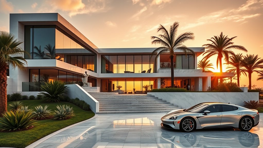 Luxury features in high-end real estate are increasingly blending cutting-edge technology with sleek design to attract discerning buyers. Smart home automation plays a pivotal role, allowing you to control lighting, climate, security, and entertainment effortlessly through centralized systems. Architectural innovation also drives investment, with properties showcasing bold, modern designs that maximize natural light, open spaces, and seamless indoor-outdoor progressions. These features not only enhance daily living but also boost property value, making them smart investments. Gated communities, waterfront access, and privacy remain key, but the focus now is on integrating technology and innovative architecture to create homes that are both functional and visually striking. As a result, luxury real estate continues to evolve into smarter, more sophisticated spaces tailored to elite lifestyles. Incorporating property features that improve energy efficiency and sustainability further increases desirability and long-term value.