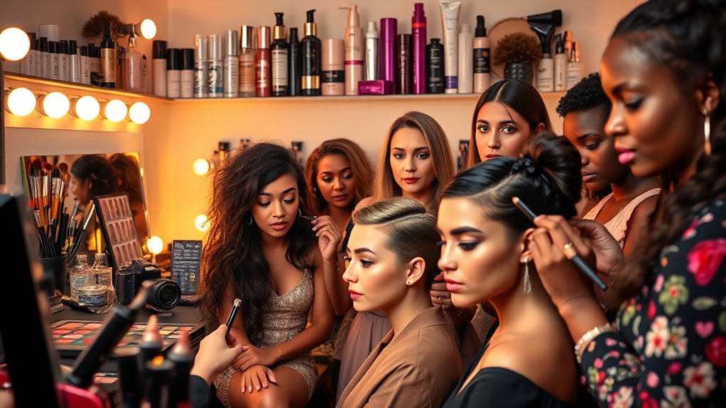 Building a successful career in the glam squad industry hinges on strong networking and reputation. You need to stay ahead of makeup trends and master cutting-edge hair techniques to stand out. Attend industry events, workshops, and collaborate with other professionals to expand your contacts. Social media is essential—share your work and engage with influencers and brands to increase your visibility. Developing a cohesive aesthetic that aligns with current trends helps attract high-profile clients. Keep refining your skills and stay adaptable to evolving styles. Building trust with clients and colleagues opens doors to new opportunities, referrals, and partnerships. Ultimately, your reputation as a reliable, talented beauty professional is your most precious asset in this competitive industry.