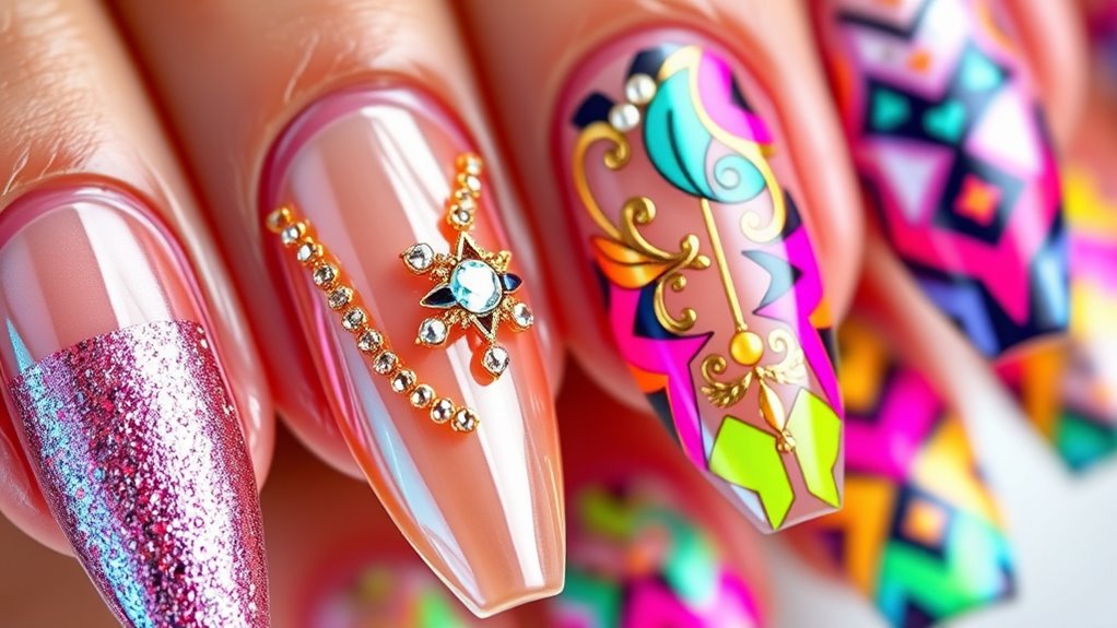 Vibrant jewel tones and soft pastel palettes are taking center stage in 2025 nail art trends, offering a striking contrast that appeals to all style preferences. These bold color choices make your nails stand out at every event, from red carpets to everyday wear. To keep your nails looking their best, prioritize nail health by choosing salons that follow strict hygiene standards and use quality products. Proper salon hygiene guarantees your nails stay strong and free from infections, especially when experimenting with intense hues and creative finishes. Whether you opt for deep burgundy, electric blue, or delicate lilac, these colors add personality and vibrancy. Remember, maintaining healthy nails helps your bold shades look even more stunning and last longer, making your manicure truly unforgettable. Additionally, selecting high-quality electric nail polishes can enhance the longevity of your vibrant shades and ensure a flawless finish.