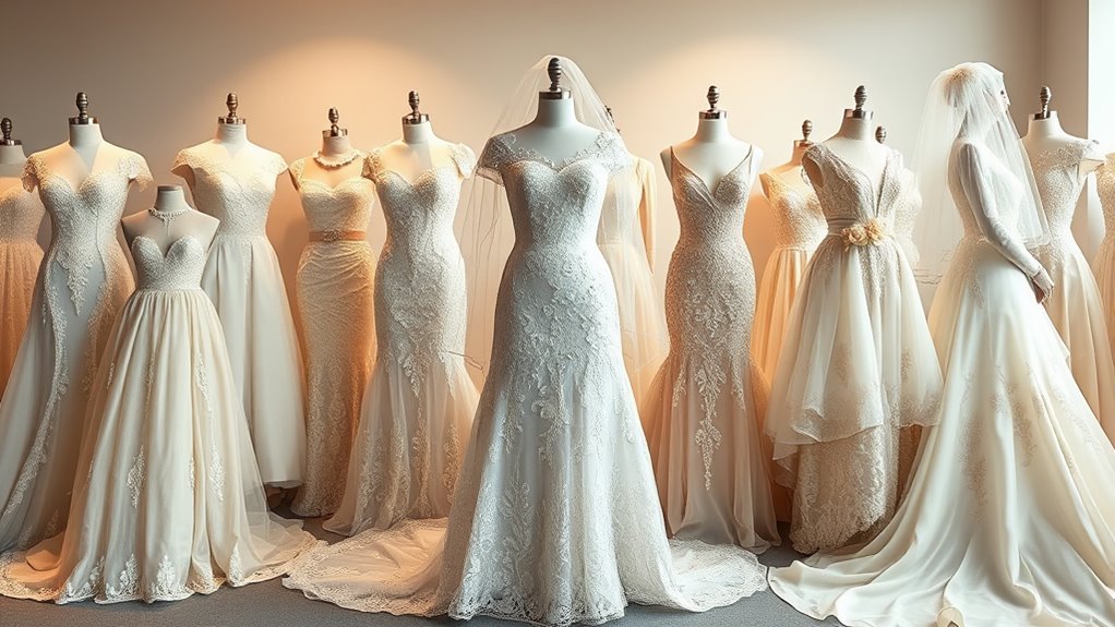 Iconic celebrity wedding dresses have left lasting impressions, blending tradition with bold innovation. Think Princess Diana’s romantic Emanuel gown with its train and pearls, or Grace Kelly’s timeless lace and satin look that defined elegance. Modern icons like Meghan Markle’s sleek Givenchy dress show a shift towards minimalist chic. From rebellious styles like Bianca Jagger’s tuxedo to vintage inspirations, these gowns forever influence bridal fashion. Keep exploring to discover the stories behind these unforgettable looks.