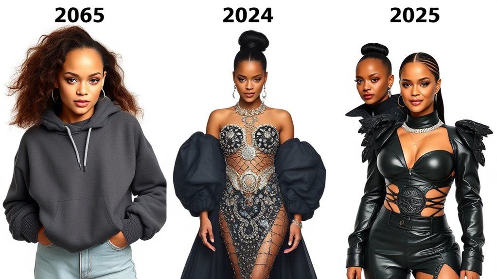 Rihanna’s style took a bold turn between 2009 and 2013, shifting from her playful island girl roots to a darker, more rebellious aesthetic. You notice her embracing gender fluidity, blurring traditional lines with androgynous looks and deconstructed silhouettes. Punk influences become clear through leather jackets, combat boots, and edgy accessories, reinforcing her defiance of conventional femininity. She experiments with bold hairstyles, like pixie cuts and vibrant hair colors, amplifying her rebellious mood. During this period, she also becomes a fashion chameleon, combining streetwear, leather, and high fashion, challenging norms and expressing her individuality. This phase marks her transformation into a fearless style icon, using gender fluidity and punk influences to redefine her image and inspire a new wave of fashion rebellion.