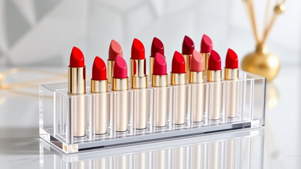 Acrylic holders help prevent lipstick color transfer or staining because they’re non-porous, making it easier to clean and less likely for colors to bleed or stain. I find that wiping them down regularly with a gentle cleaner keeps my makeup looking fresh and prevents any buildup. While they don’t completely eliminate staining if a lipstick is very pigmented, acrylic holders definitely minimize the risk compared to porous materials.