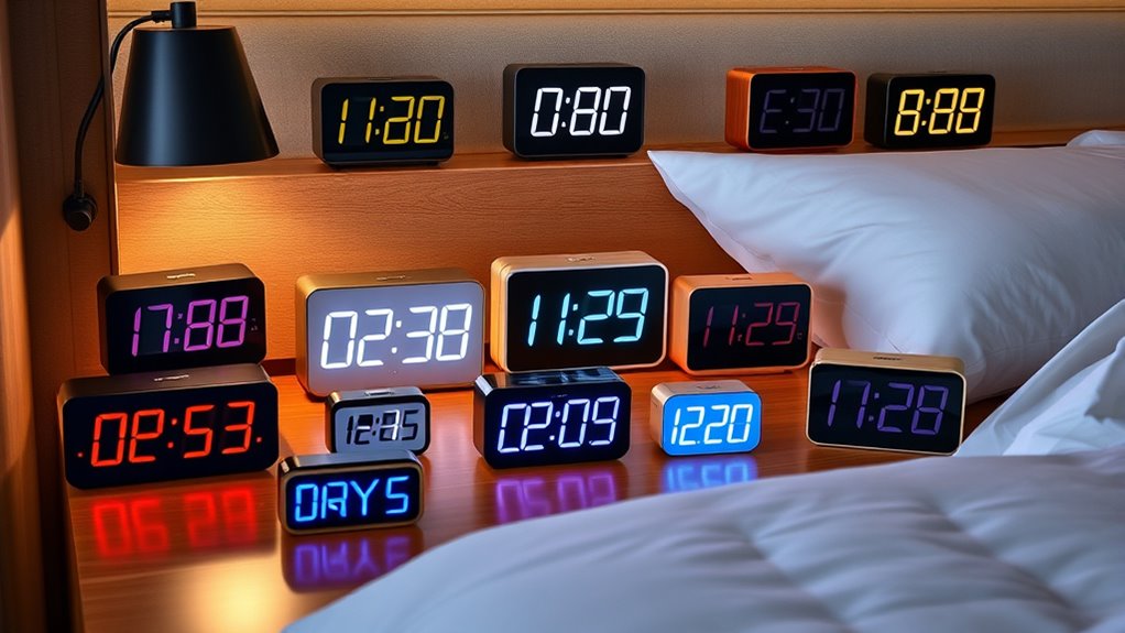 If you’re looking for the top designer LED alarm clocks that blend style with function, I’ve found some great options. I prefer sleek models like mirror surface clocks, modern large-display designs, and colorful kid-friendly options. Many feature adjustable brightness, USB charging, and unique shapes that complement different decor styles. These clocks not only wake you efficiently but also add aesthetic value to your space. Keep exploring, and I’ll share all the details you need to choose the perfect one.