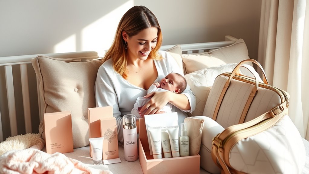 I always recommend new moms choose skincare products labeled as safe and gentle, like those with natural ingredients and free from parabens, phthalates, and synthetic fragrances. Look for brands that are dermatologist-tested and specifically formulated for sensitive skin. I personally favor products with soothing ingredients like aloe vera and chamomile. Always check with your healthcare provider before trying new skincare, especially during pregnancy or breastfeeding, to guarantee safety.