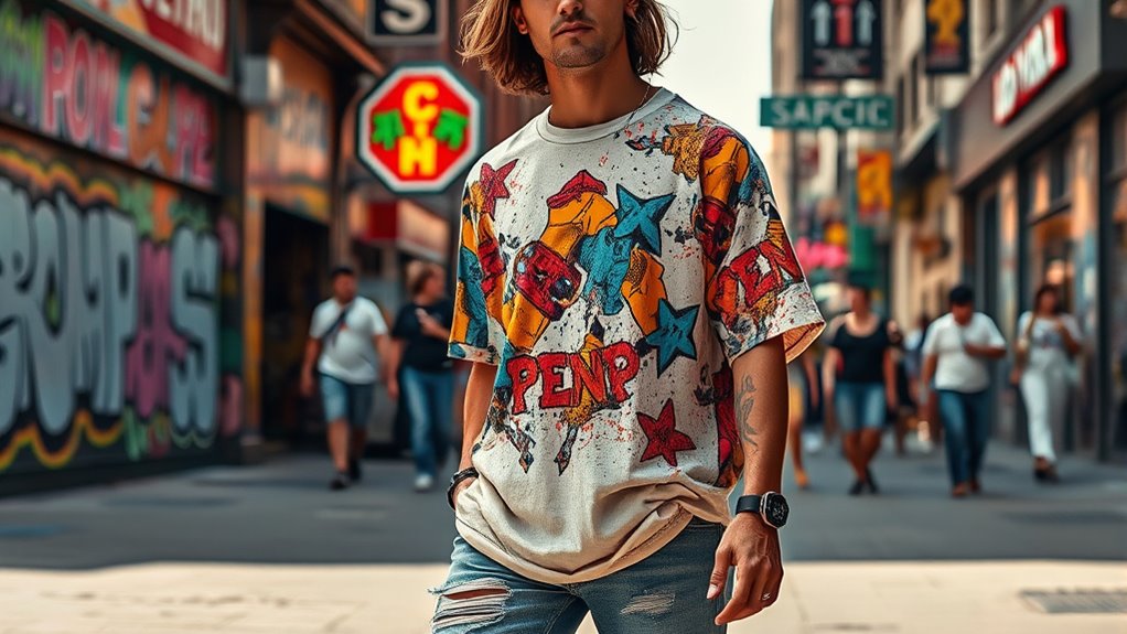 Imagine turning a blank canvas into your personal masterpiece. I love to personalize oversized graphic tees by adding patches, embroidery, or even hand-drawn designs with fabric markers. You can also cut and knot the fabric for a unique fit or iron on custom decals. It’s all about expressing your style effortlessly—think of it as creating wearable art that’s uniquely you and instantly elevates your street look.