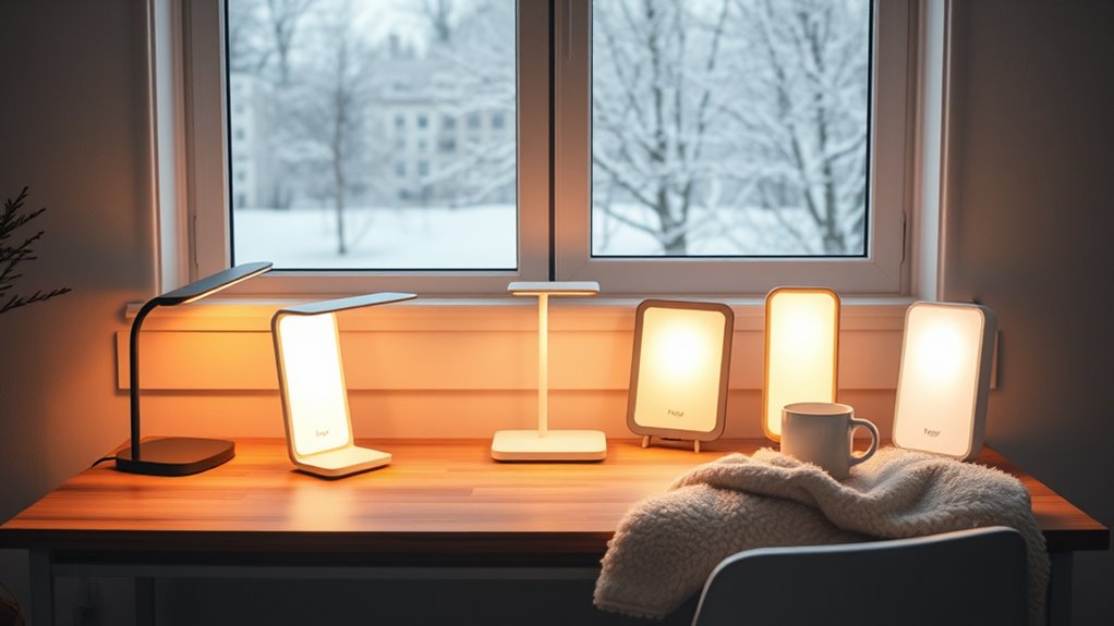 If you’re battling winter blues, I recommend choosing from the top five sad lamps designed for effective light therapy. Look for options with at least 10,000 lux brightness, adjustable color temperatures, and multiple brightness levels for personalized use. Features like timers, UV-free lights, and portability make therapy safer and more convenient. If you keep exploring, you’ll find detailed insights on what makes these lamps truly stand out and how to pick the best one for you.