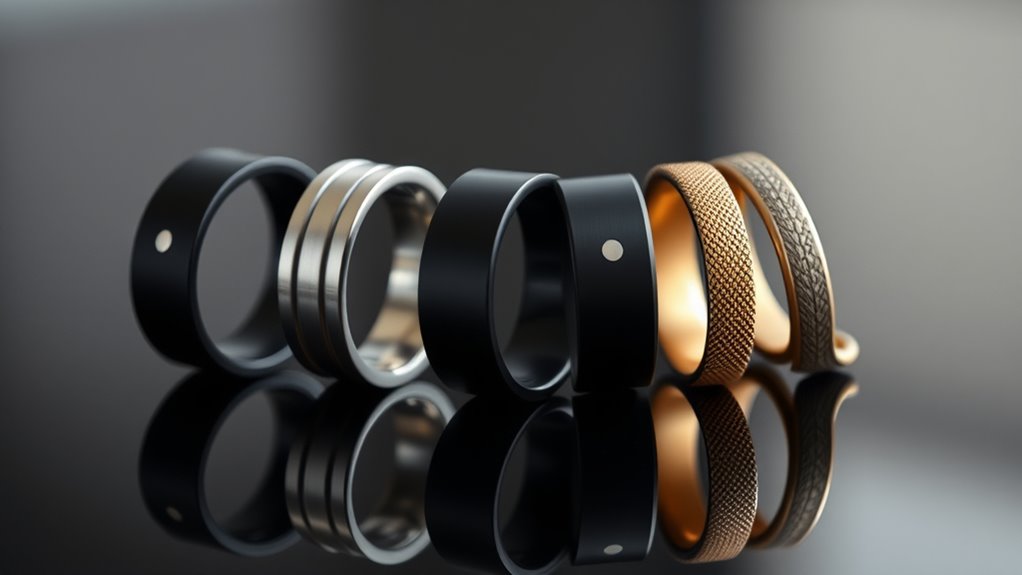 A comfortable fit is essential for getting the most out of your smart ring’s fitness tracking capabilities. When a ring fits well, it stays securely in place during all activities without causing discomfort or skin irritation. Proper sizing is key, and I recommend using a dedicated sizing kit to find the perfect fit—neither too tight nor too loose. The material also matters; hypoallergenic metals like titanium help prevent irritation and suit sensitive skin. An ergonomic design with a smooth, rounded surface minimizes pressure points, making prolonged wear more comfortable. When your ring fits well, it maintains consistent contact with your skin, which improves sensor accuracy and data reliability. Ultimately, a well-fitting smart ring feels almost like a natural extension of your body, encouraging consistent wear and better health insights.