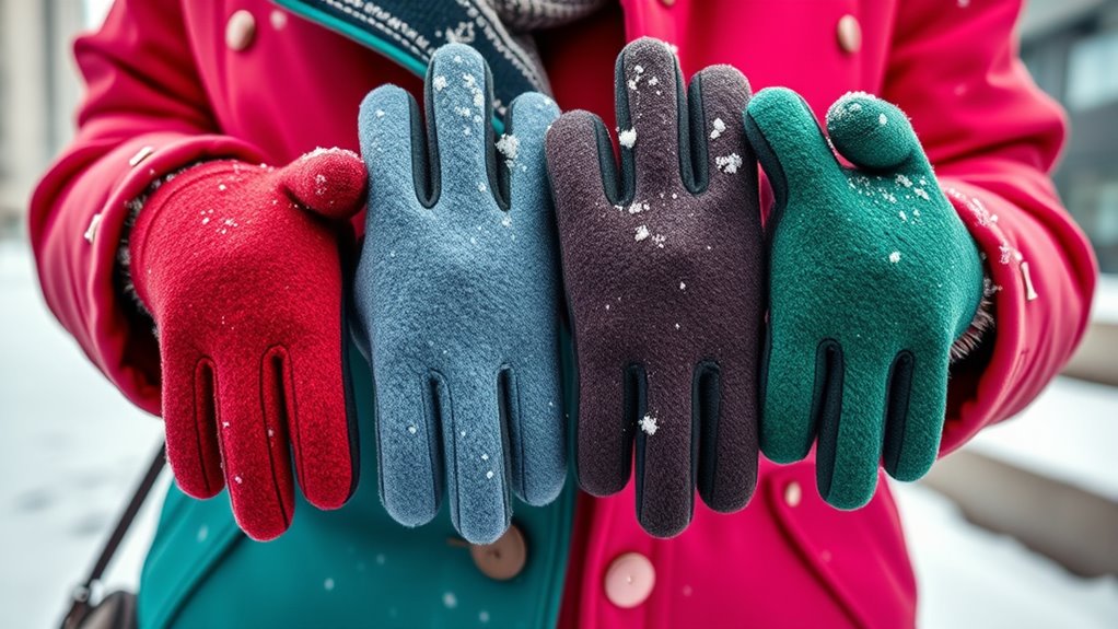Optimizing touchscreen gloves for cold weather isn’t just about ensuring they respond accurately; it’s also about keeping your hands warm in low temperatures. The insulation level plays a key role in this, as thicker materials like wool or fleece provide better heat retention than lightweight synthetic fabrics. Higher insulation density helps protect against windchill and extreme cold, making your hands more comfortable during outdoor activities. Gloves with multiple layers or thermal linings offer even greater warmth, especially in harsh winter conditions. However, it’s important to balance insulation with dexterity, so you can still perform tasks without feeling restricted. Matching the insulation level to your activity and climate ensures your hands stay warm without sacrificing the ease of movement necessary for touchscreen use.