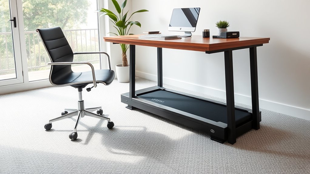 Imagine a tiny treadmill trying to dance under a giant desk—now, does it fit every height? Not quite. I’ve found that many under-desk treadmills are adjustable, but compatibility varies. I recommend checking the maximum height clearance and adjustable features before buying. Trust me, your desk’s height and the treadmill’s specs need to sync, or you’ll be stuck in a workout limbo—neither comfortable nor productive.