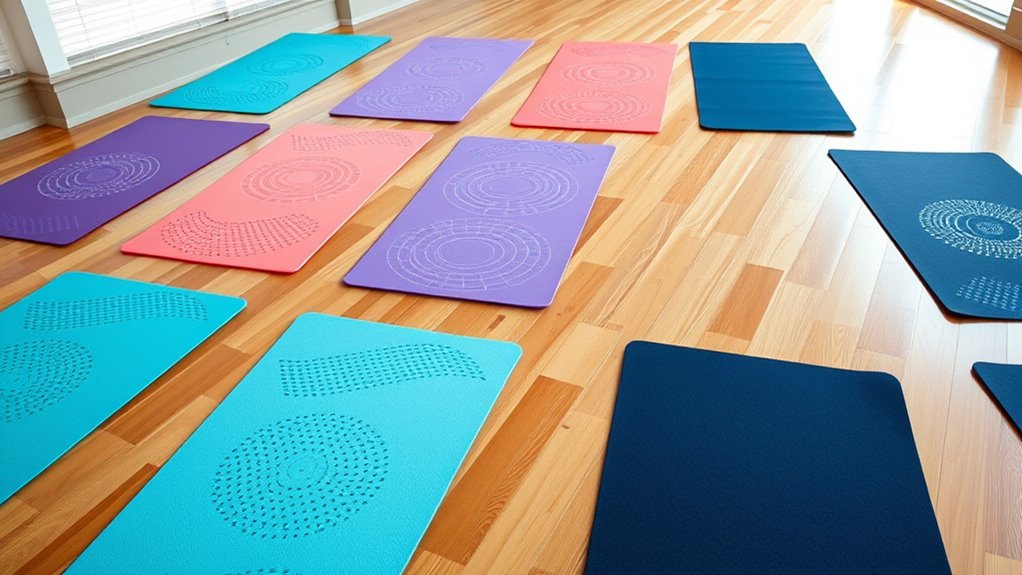Selecting a yoga mat made from safe, eco-friendly materials is essential for both your health and the environment. I look for mats crafted from non-toxic options like TPE, natural rubber, or SGS-certified PVC, ensuring they’re free from harmful chemicals like phthalates, heavy metals, and BPA. These substances can pose health risks and should be avoided. I also check that the surface is textured and non-slip, especially since eco-friendly materials can sometimes vary in grip. Durability is key—I want a mat that resists tearing, deformation, and wear over time. Additionally, I prefer hypoallergenic, odorless, or minimally odorous mats, so they’re comfortable for sensitive skin and indoor use. Prioritizing safety and eco-friendliness helps me practice confidently and sustainably.